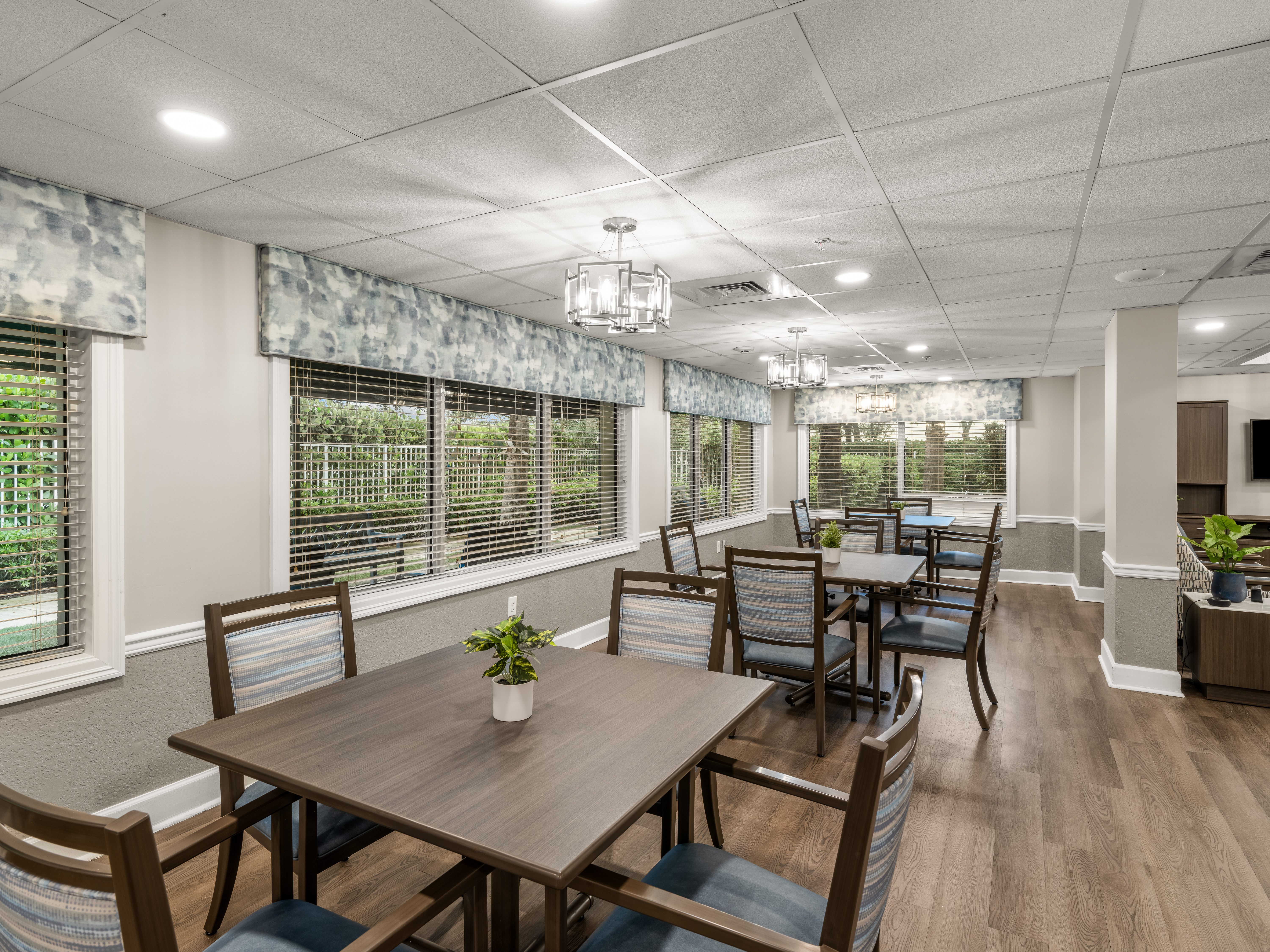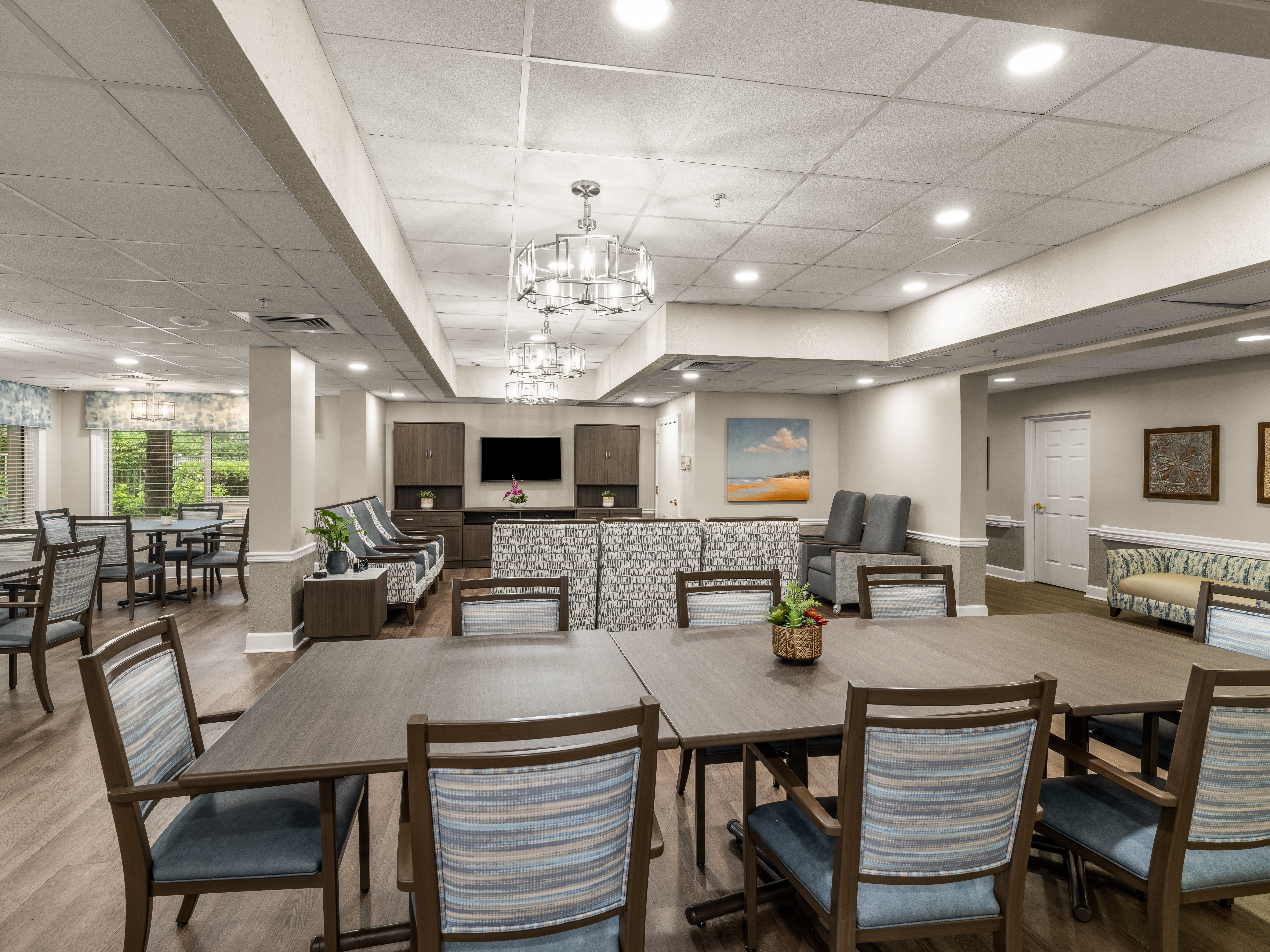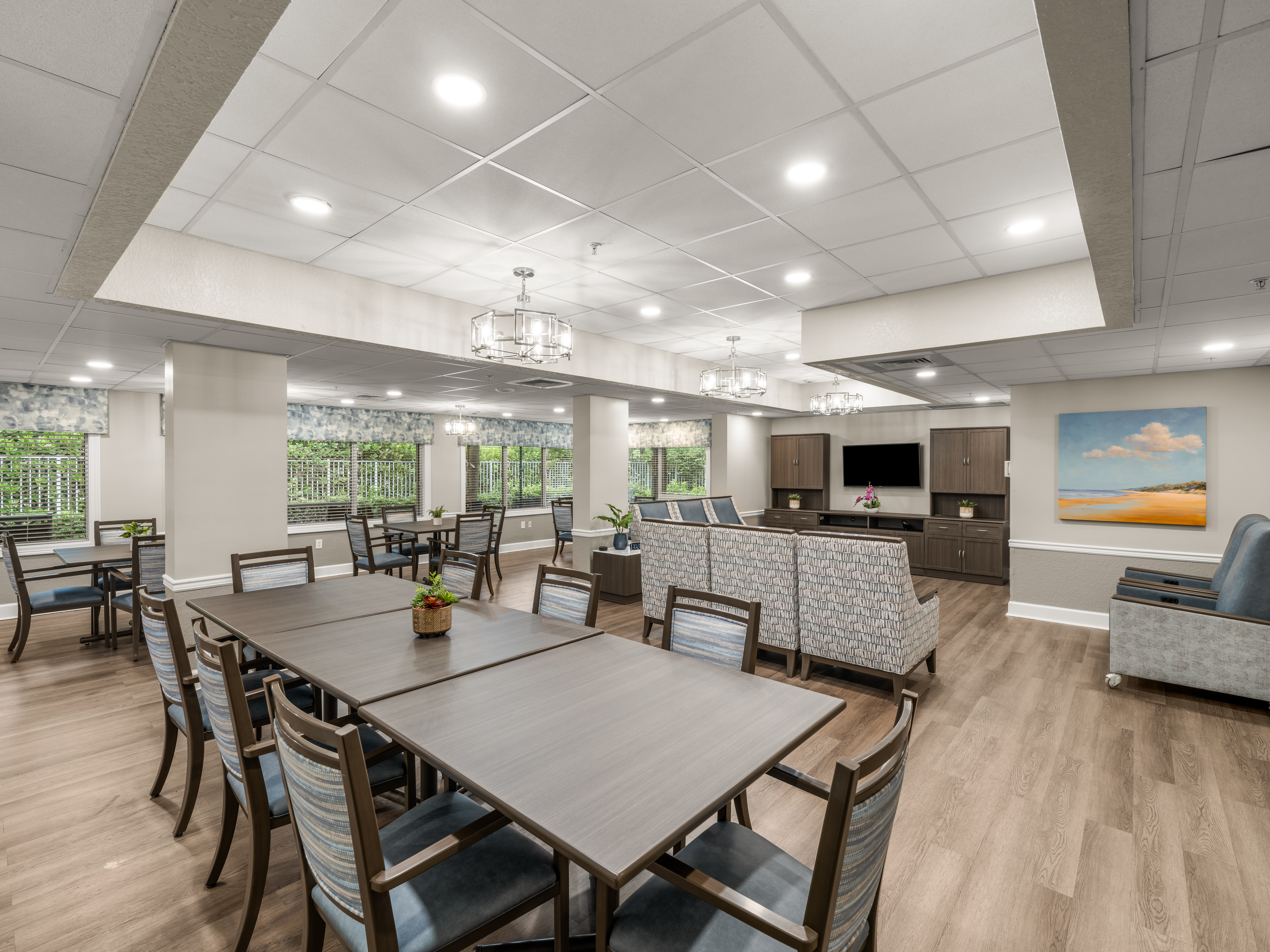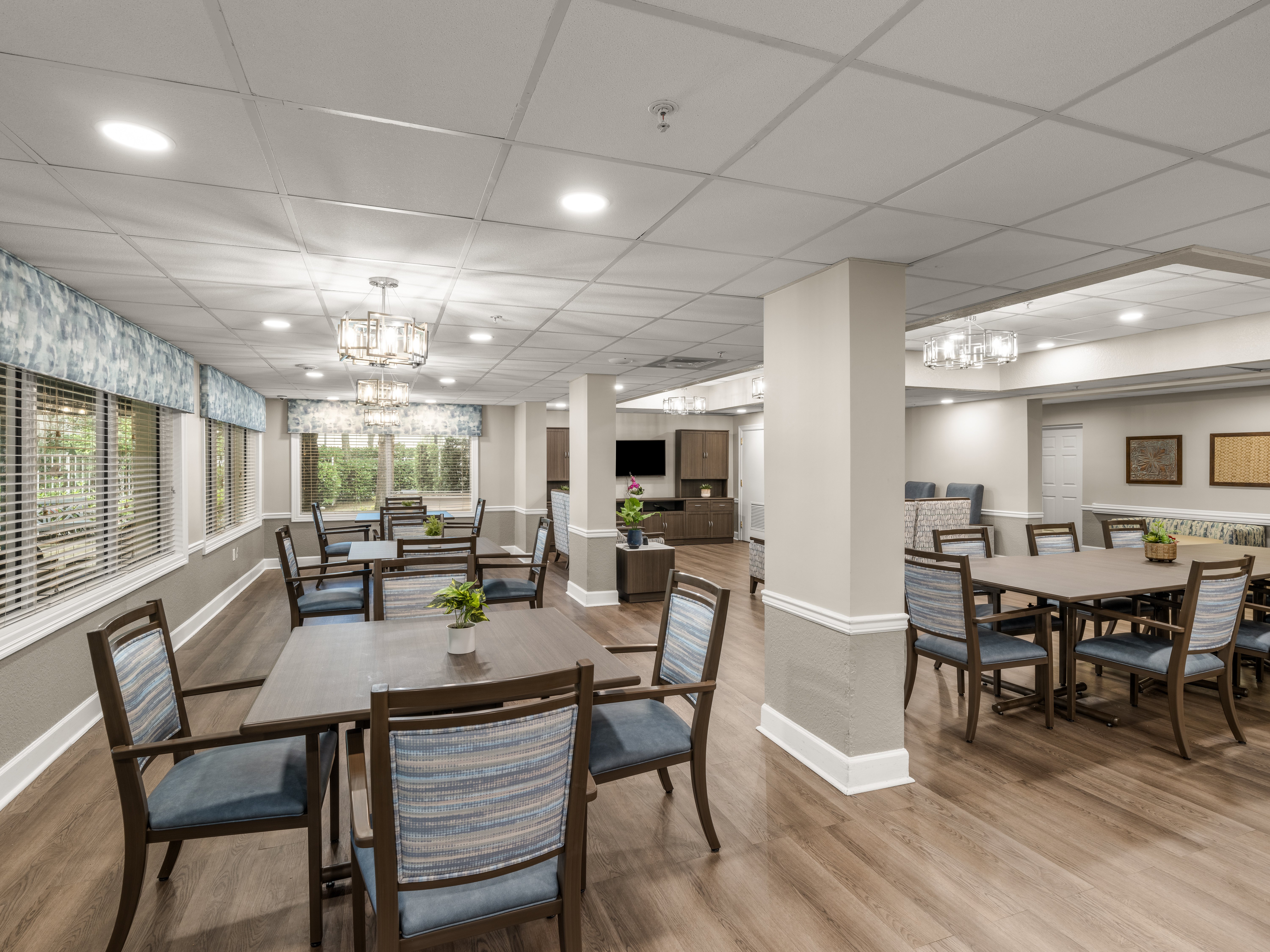 Our dining experiences are some of the most important parts of the day, offering more than just a meal, but a moment to connect and enjoy. Our chef-prepared, restaurant-style dining features fresh, seasonal ingredients and a choice of delicious and nutritious menu options to meet each resident’s preferences and abilities. Our compassionate team is trained to engage and support each resident to ensure a pleasant experience and apply tools as needed to assist, like our “dining on the run” program, adaptive utensils, modified diets, and dignified prompting and cues.